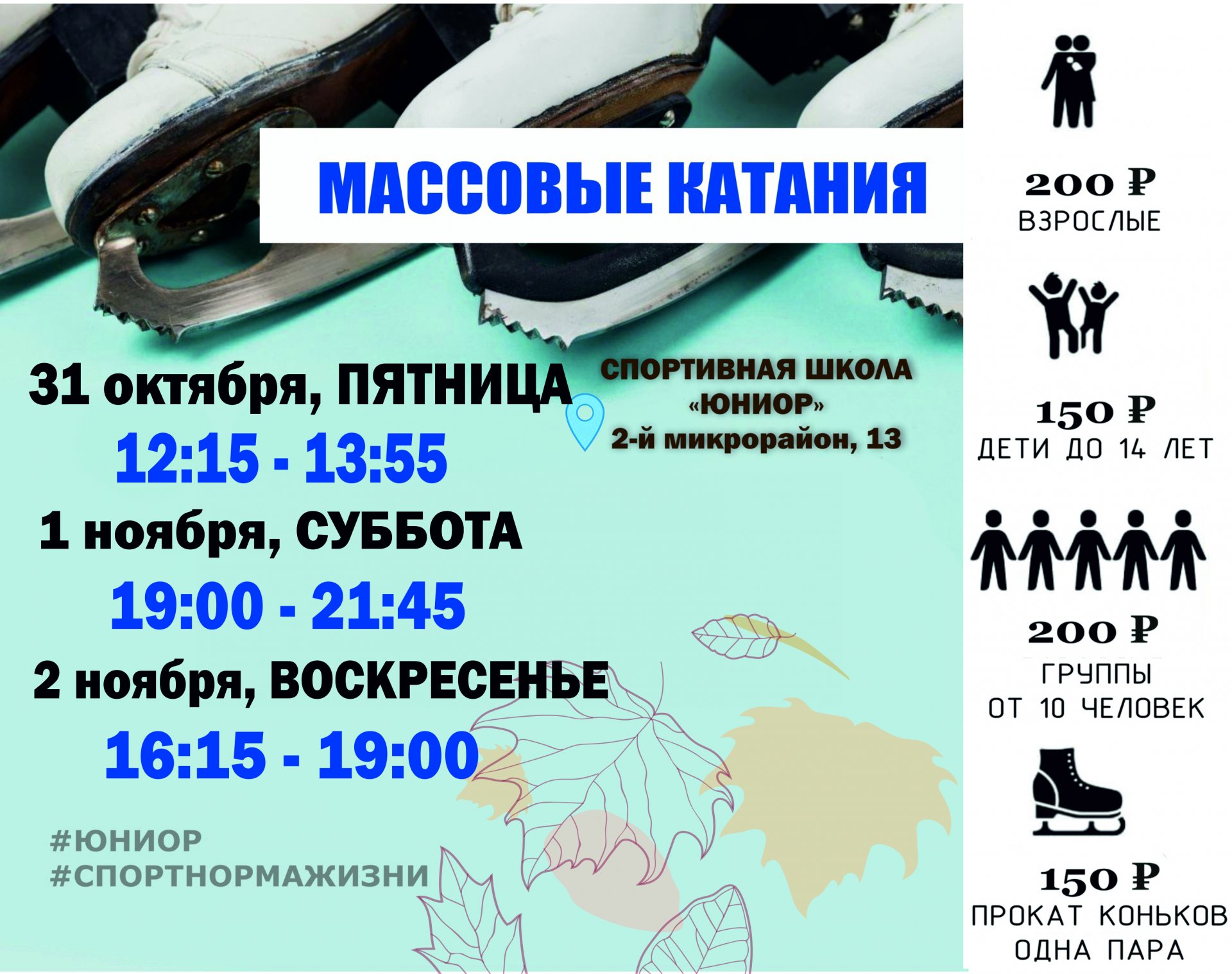 Массовые катания Даты: 31 октября, 1, 2 Ноября ???? Группы от 10 человек в сопровождении преподавателя или воспитателя — всего 200 рублей с человека. ???? Обратите внимание, что во время массовых катаний может проводиться техническая подгото