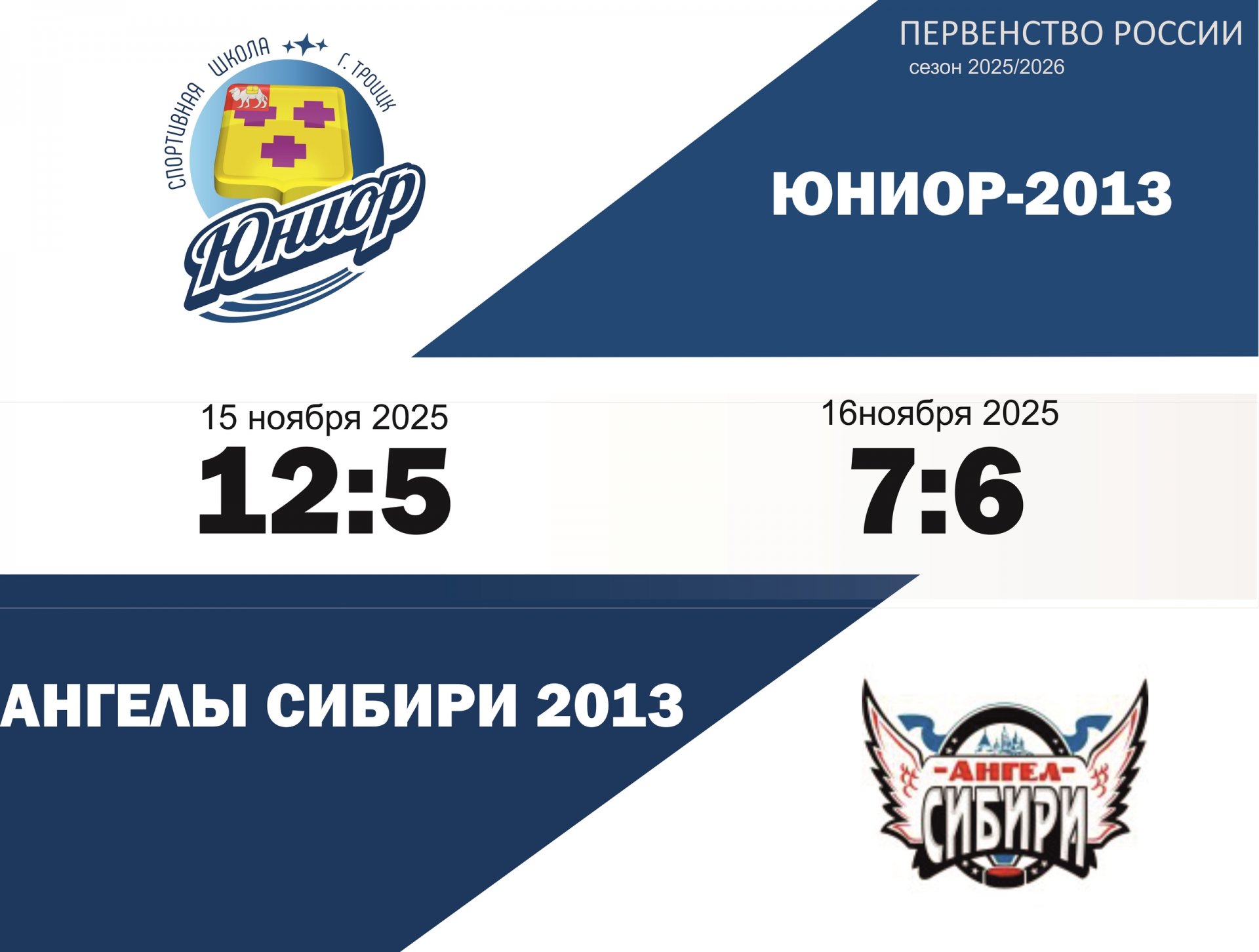 24.11.2025. В период с 15 по 16 ноября в городе Тобольске прошли захватывающие игры между командами Юниор 2013 и Ангел Сибири 2013. Домашние матчи команд Юниор 2009 и Астра 2009 УФА2